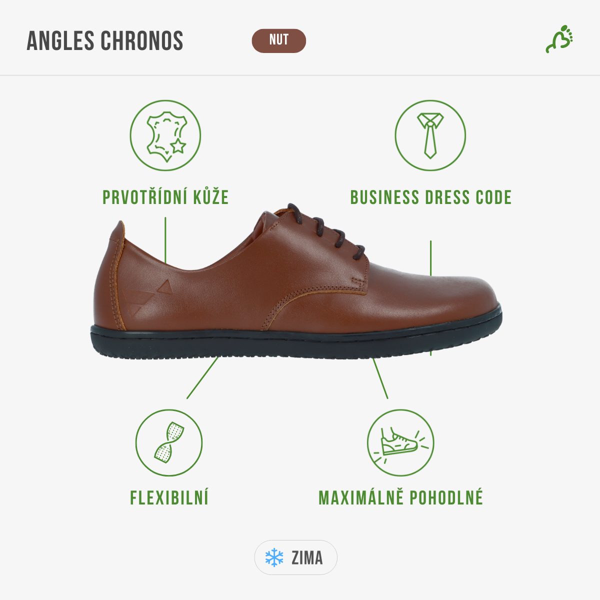 Tyto boty ocení každý, kdo nechce dělat kompromisy mezi stylem a zdravým pohybem. ANGLES Chronos jsou pohodlné, lehké a elegantní barefoot polobotky pro každodenní nošení.
